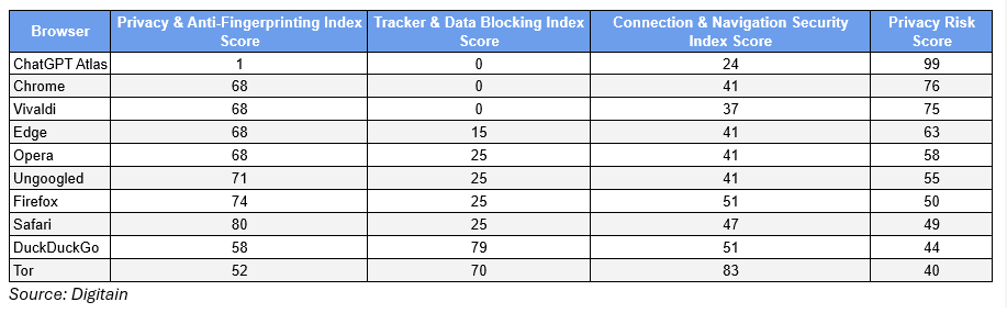 ChatGPT Atlas is the least private browser of all. OpenAI’s newly launched tool failed nearly every privacy test conducted in the study, scoring just 1 point in anti-fingerprinting protection and 0 in tracker blocking.